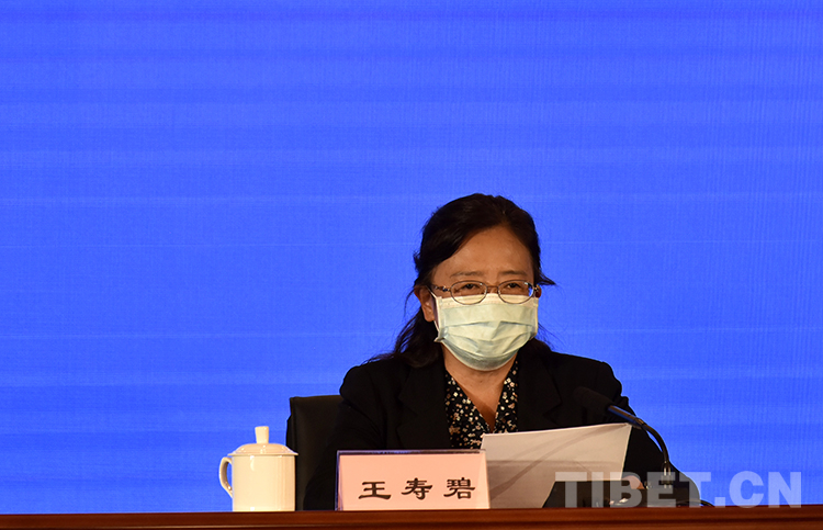圖為西藏自治區(qū)新型冠狀病毒肺炎疫情防控工作第三場新聞發(fā)布會(huì)上,西藏自治區(qū)衛(wèi)生健康委員會(huì)一級巡視員王壽碧介紹西藏新冠肺炎疫情防控工作最新情況 攝影:王媛媛