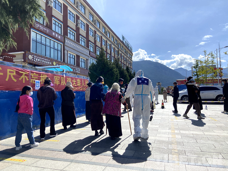 林芝邊境管理支隊輪訓(xùn)隊民警孫震正攙扶行動不便的老人前往核酸檢測點 攝影:任遠(yuǎn)波