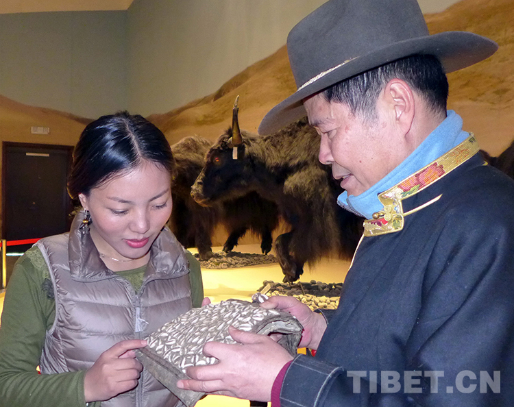 這是吳雨初在向負(fù)責(zé)展品管理的藏族女兒桑旦拉卓介紹牦牛皮挎包的制作方法(唐召明提供,2015年3月27日攝)