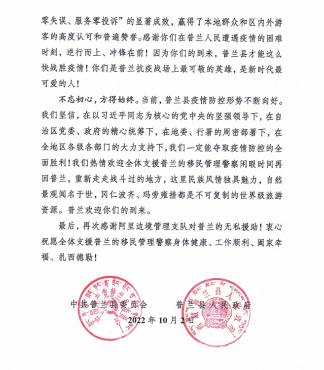 中國西藏網(wǎng)訊 “普蘭縣發(fā)生新冠肺炎疫情后,阿里邊境管理支隊第一時間選派精干力量支援普蘭疫情防控工作,為打贏疫情防控阻擊戰(zhàn)、攻堅戰(zhàn)發(fā)揮了至關(guān)重要的作用?!?0月2日,西藏自治區(qū)阿里邊境管理支隊收到一封來自阿里地區(qū)普蘭縣委的感謝信。信中對阿里邊境管理支隊戰(zhàn)“疫”一線民警在一個多月的疫情防控工作中,克服困難、勇于擔當、不分晝夜、持續(xù)奮戰(zhàn)的抗疫工作表達了感謝,給予了肯定。