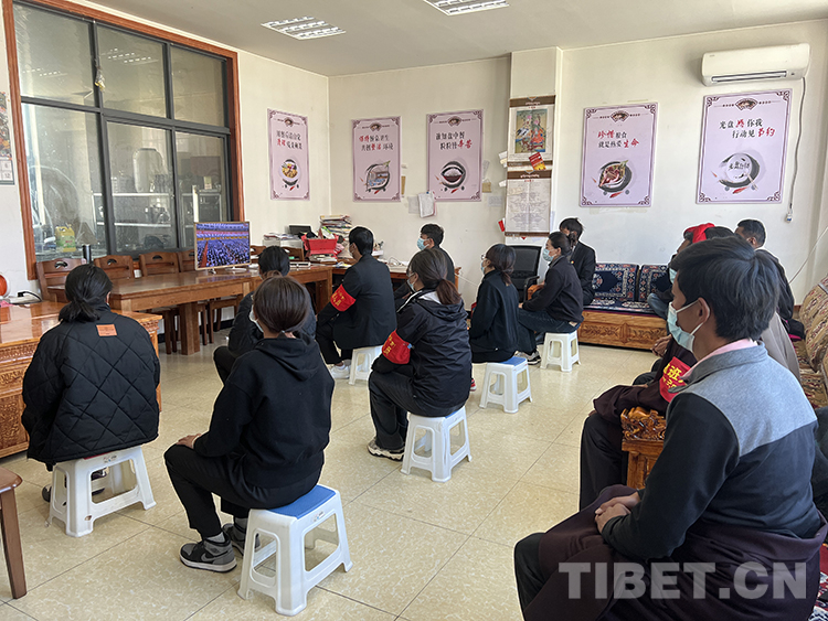 圖為西藏自治區(qū)拉薩市堆龍德慶區(qū)德慶鎮(zhèn)門堆村村“兩委”、駐村工作隊等觀看黨的二十大開幕會 攝影:鮑存根