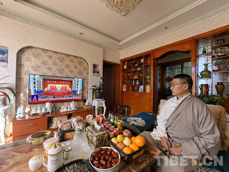 圖為扎西尼瑪在家中觀看黨的二十大開幕會 圖片由本人提供