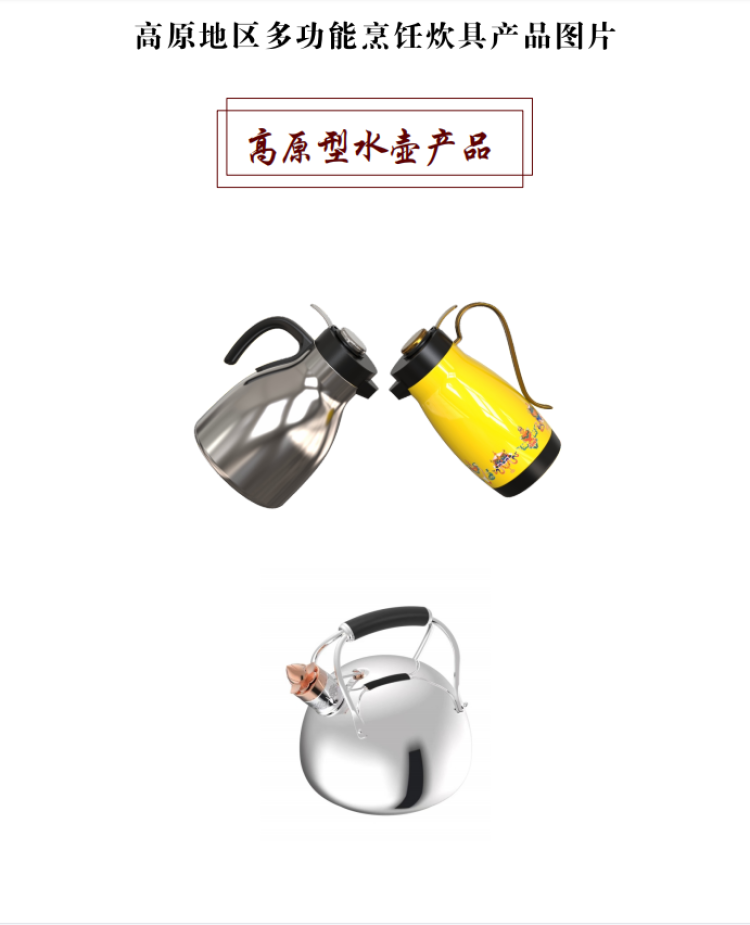 西藏自治區(qū)海拔跨度大,人民群眾生活范圍主要在800米至5000米左右,針對(duì)不同海拔高度需要不同烹飪壓力及不同烹飪時(shí)間的需求,研發(fā)的高原地區(qū)多功能烹飪炊具可實(shí)現(xiàn)一鍵調(diào)壓、多檔控壓和感溫定時(shí)功能。新研發(fā)的壓力鍋針對(duì)不同的海拔地區(qū)可以實(shí)現(xiàn)不同的壓力控制,從而在不同的沸點(diǎn)均能快速煮熟食物,實(shí)現(xiàn)與區(qū)外煮熟時(shí)間相同,且兼具口感,并保留食物更多的營(yíng)養(yǎng)成分。新研發(fā)的高原地區(qū)專用燒水壺(明火款、電子款)也實(shí)現(xiàn)了在不同海拔地區(qū)均能與區(qū)外相同時(shí)間使壺內(nèi)水沸騰后達(dá)到100℃,從而保障高原地區(qū)廣大群眾都能喝上燒開的水。