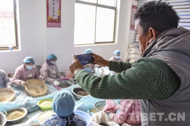 圖為瓊結(jié)縣下水村江瑟農(nóng)產(chǎn)品專業(yè)合作社一名農(nóng)牧民群眾正在蕎麥加工車間錄制小視頻上傳至“文化銀行”兌換積分