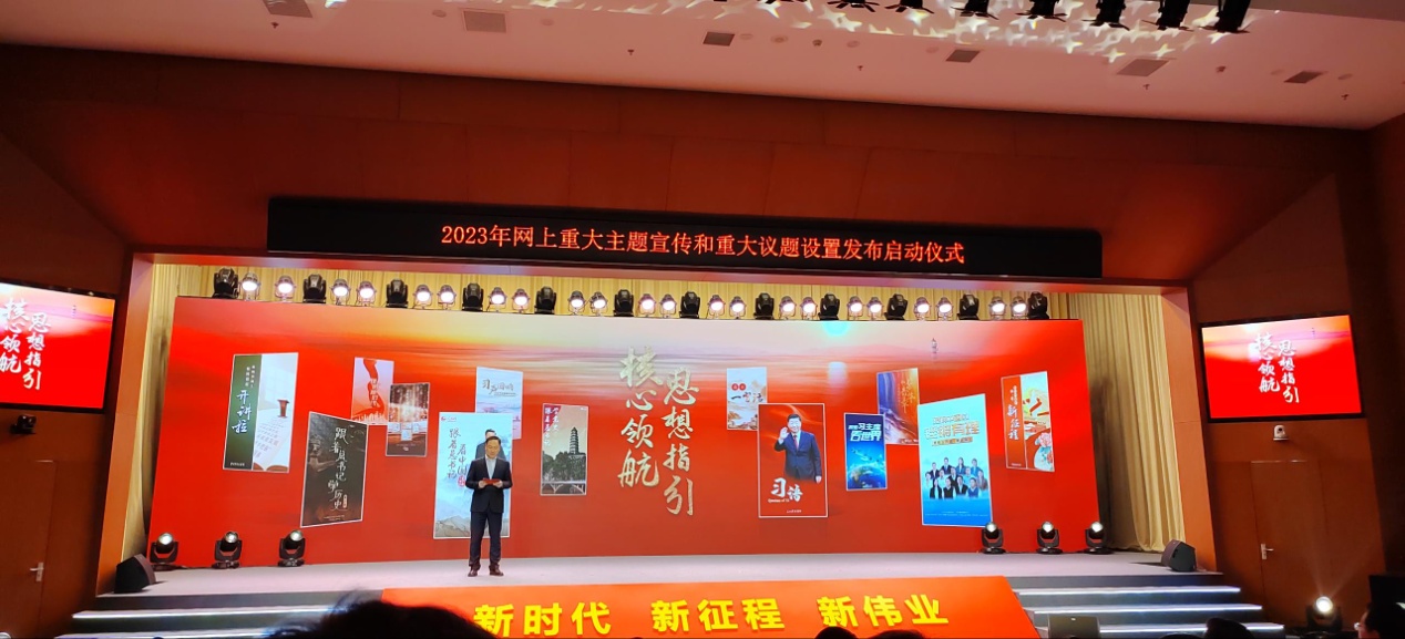 圖為“團(tuán)結(jié)奮進(jìn)新征程 奮楫揚帆再出發(fā)”2023年網(wǎng)上重大主題宣傳和重大議題設(shè)置發(fā)布啟動儀式主會場