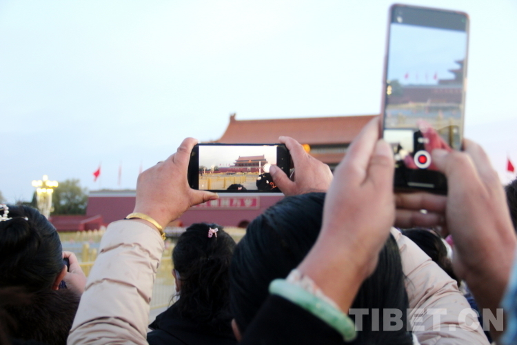 圖為“2023年西藏基層婦聯(lián)干部赴京學(xué)習(xí)參觀團(tuán)”成員們紛紛用手機(jī)記錄下國旗護(hù)衛(wèi)隊行進(jìn)的英姿 攝影:陳浩力