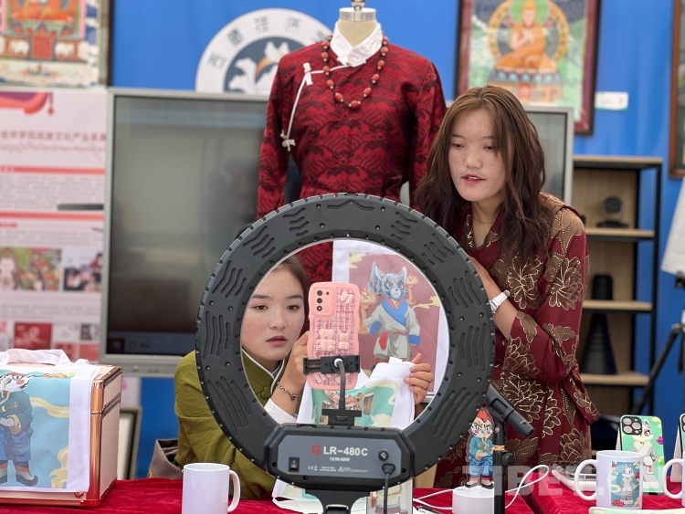 在展示交流區(qū),兩名穿著藏裝的姑娘正在通過(guò)直播向觀眾介紹有十二生肖圖案的被子、手機(jī)殼、筆記本等各類產(chǎn)品,也吸引著現(xiàn)場(chǎng)嘉賓前來(lái)參觀?!斑@些作品是民族文化產(chǎn)業(yè)系學(xué)生的作品,圖案都是學(xué)生自己繪畫的原創(chuàng)文創(chuàng)產(chǎn)品?!蔽鞑丶紟煂W(xué)院數(shù)字信息產(chǎn)業(yè)系教師桑珍介紹,“兩位姑娘是21級(jí)電商專業(yè)學(xué)生,通過(guò)這次活動(dòng)一方面希望自己得到鍛煉,另一方面也是為7月份的電商大賽做前期的培訓(xùn)?!?/p>