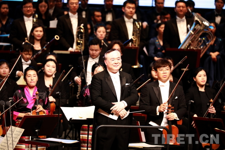 本場音樂會由中國文聯(lián)副主席、書記處書記,中央音樂學(xué)院院長,著名指揮家俞峰擔(dān)任指揮,中央音樂學(xué)院交響樂團(tuán)與西藏自治區(qū)歌舞團(tuán)愛樂樂團(tuán)聯(lián)合伴奏。圖為本場音樂會指揮俞峰(前排中) 攝影:劉莉