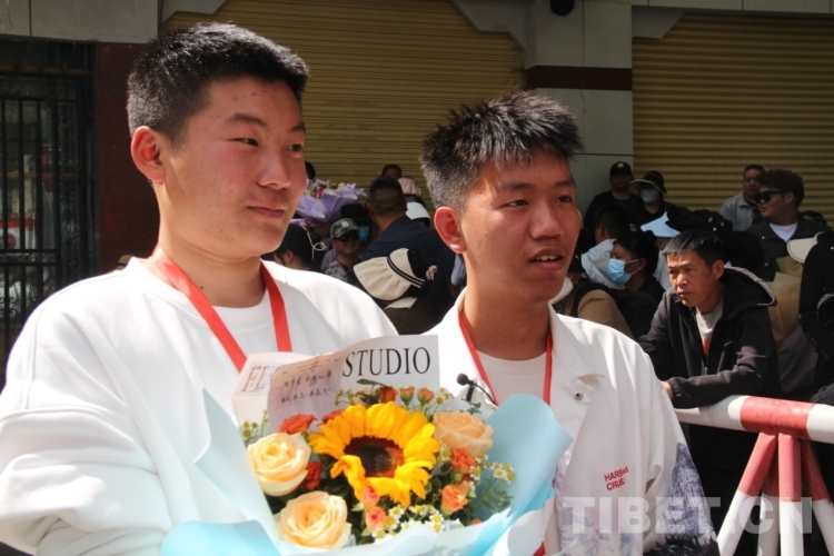 6月8日下午,在拉薩中學(xué)考場(chǎng)外,家長們穿著藏裝、旗袍、印有“金榜題名”“旗開得勝”等加油短袖,手捧鮮花和哈達(dá)迎接第一波結(jié)束高考的考生?!敖裉欤|女終于要結(jié)束高中生活了,希望她能如愿考上軍校?!眲?span style="background-color: rgb(255,255,255)">先生夫婦穿著專門為女兒定制的加油短袖,備好鮮花到考場(chǎng)外迎接女兒。像他們一樣,考場(chǎng)外拿著鮮花與哈達(dá)、祝賀橫幅、勵(lì)志牌等的考生家屬和親戚漸漸多了起來。