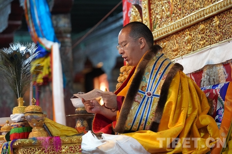 在措欽大殿內(nèi),班禪每到一座佛像前都雙手合十為眾生祈禱,并向佛像敬獻(xiàn)哈達(dá),祈求國(guó)泰民安、利樂(lè)眾生。措欽大殿內(nèi)的眾僧也并排而坐齊聲誦經(jīng)、虔誠(chéng)祝禱。禮佛后,班禪登上措欽大殿寶座,寺廟高僧代表向班禪敬獻(xiàn)曼扎(佛像、經(jīng)書(shū)、佛塔)、誦祈愿永駐贊;班禪向寺廟僧眾傳授賜予《文殊真實(shí)名經(jīng)》,并為僧眾摸頂。