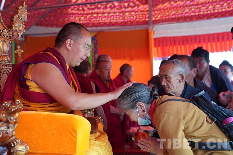 年逾七旬的洛桑巴姆得到班禪摸頂后倍感殊勝,激動(dòng)地落下了眼淚。“能拜見(jiàn)活佛特別開(kāi)心,得到活佛的摸頂賜福是我的福分?!甭迳0湍凡粩嗷仡^面向班禪躬身祈禱,久久不愿離去。