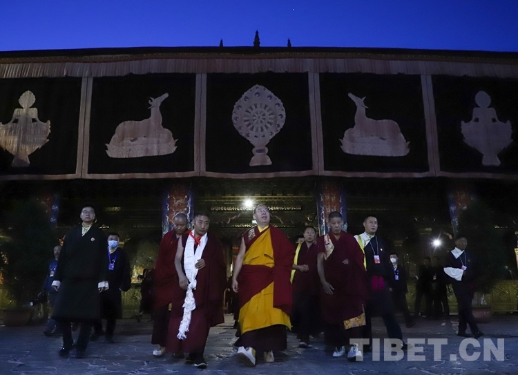 夜色中的古城拉薩靜謐祥和,千年古寺大昭寺燈火通明。凌晨5時許,大昭寺的僧人組成“色彰”隊,高舉經(jīng)旗、手持藏香,以藏傳佛教最高禮儀在通往大殿的兩側列隊恭迎班禪。