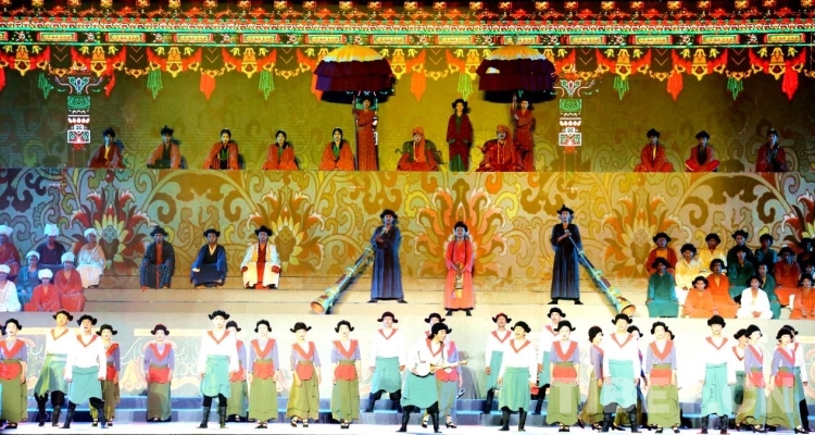 隨后盛大的開幕式文藝演出如期而至。演出共分為《悠遠(yuǎn)古韻》《詩意微芒》《如炬經(jīng)典》《輝煌盛世》四個篇章。《悠遠(yuǎn)古韻》篇章為大型情景表演,結(jié)合古格壁畫為開場表演,展現(xiàn)出阿里人民群眾的精神面貌和獨特的阿里神韻?!对娨馕⒚ⅰ穮R集阿里地區(qū)諸多極具代表性的國家級非物質(zhì)文化遺產(chǎn)節(jié)目,展現(xiàn)阿里地區(qū)悠久燦爛的古代文明遺存。《如炬經(jīng)典》篇章通過不同舞蹈,展現(xiàn)阿里獨具特色的民間歌舞文化?!妒⑹老腋琛穭t展現(xiàn)了阿里地區(qū)以熱情昂揚(yáng)的姿態(tài)在全力以赴推動建設(shè)雪域高原“西部明珠”中取得的一系列可喜的成績。