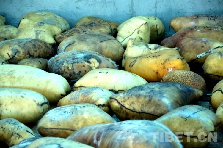 一袋袋用牛羊肚包裹的“酥油磚”整齊碼放在倉(cāng)庫(kù)的一角,黃澄澄、金燦燦。每個(gè)上面寫著一串藏文,里面包含了誰家生產(chǎn)的,公斤數(shù)、生產(chǎn)日期等信息。