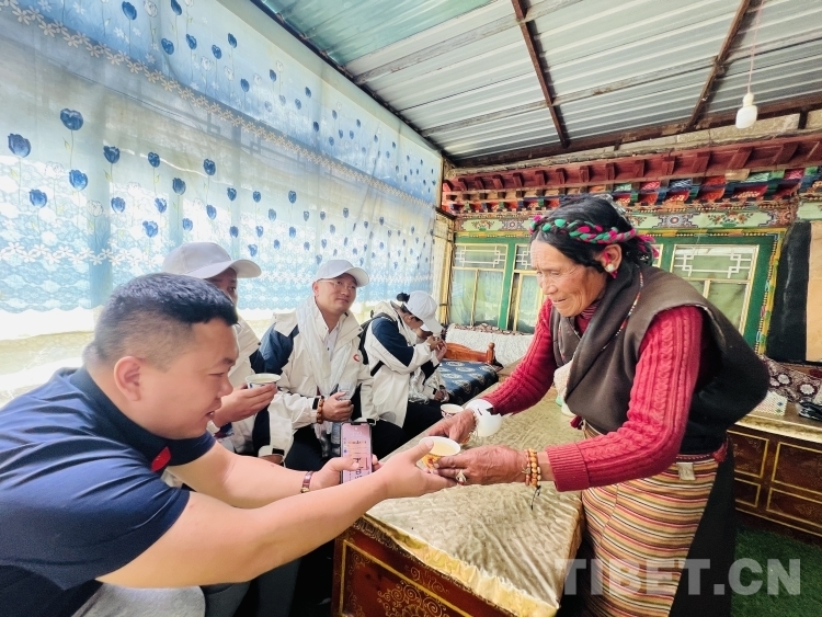 圖為慰問困難家庭時阿媽次仁為愛心志愿者到酥油茶 攝影:德吉卓瑪