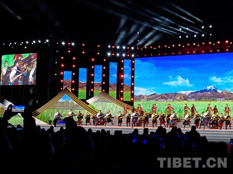 圖為文藝演出舞蹈《飛弦踏青》表現(xiàn)雪域兒女踏著新時(shí)代的節(jié)奏,快步邁向美好未來的信心與激情 攝影:次旦拉姆