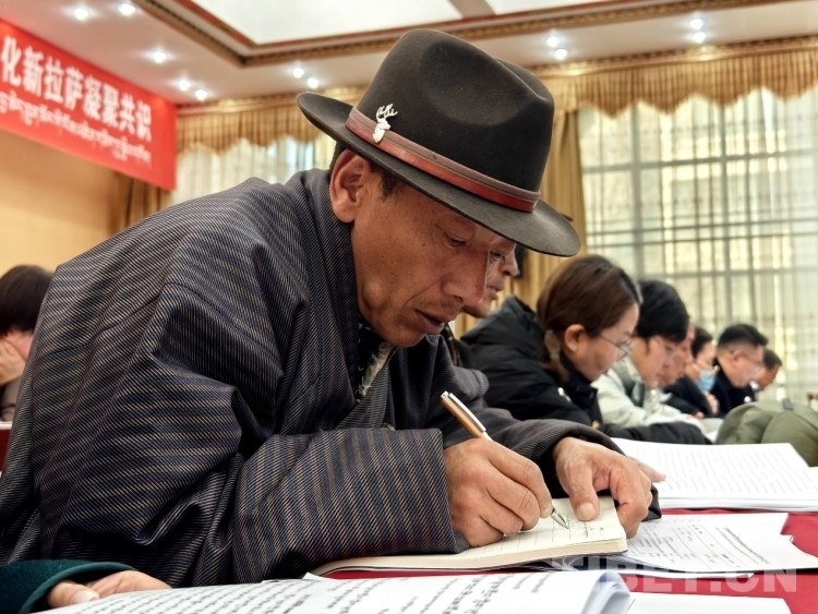 圖為開幕會現場政協(xié)委員認真做著筆記 攝影:次旦拉姆