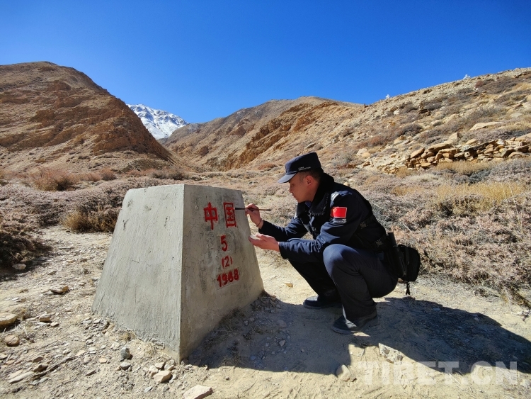 巡邏結束回到執(zhí)勤點后,邊巴次仁并沒有卸下執(zhí)勤裝備,而是拿著毛筆和紅油漆朝著執(zhí)勤點的河對岸走去,過河幾百米便是中尼5號界樁?!爸挥袌允卦谶吘车奈覀儾拍荏w驗到,除夕這天,為界碑描紅的自豪感。”他拿出毛筆跟紅漆一筆一劃地描著界碑上的每一個字。“描紅界碑那一刻,眼前是界碑,身后是祖國,我們守的是萬家燈火?!边叞痛稳恃凵駡远ǖ乜粗砬暗慕绫f。