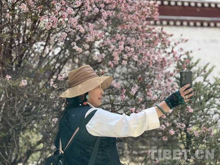 圖為3月19日,拉薩市民在布達(dá)拉宮腳下的宗角祿康公園里賞花并拍照留念 攝影:德吉卓瑪