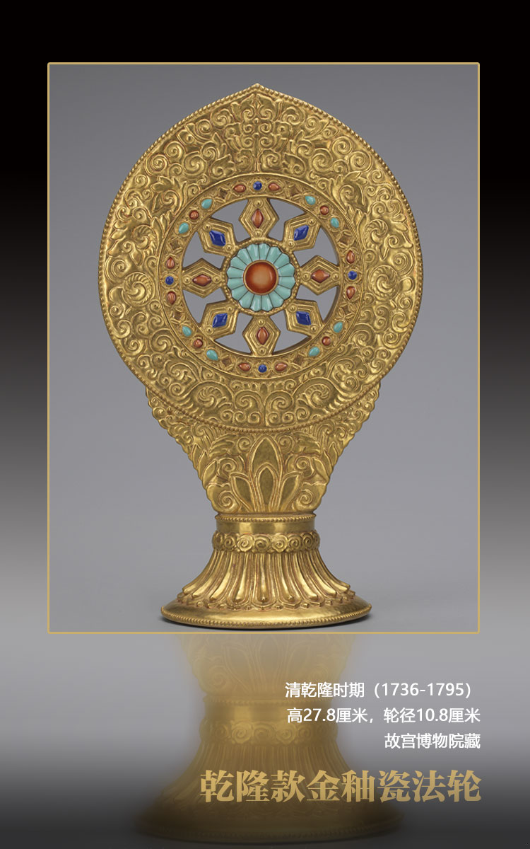 清代皇家崇奉藏傳佛教,乾隆登基后曾命內(nèi)務(wù)府造辦處下屬的景德鎮(zhèn)御窯廠燒制各式瓷質(zhì)佛像與法器備供奉之用。此款金釉瓷法輪仿自當(dāng)時(shí)銅鎏金法輪,為乾隆朝所首創(chuàng),至嘉慶朝仍有制作,只是底款不同,型制并無(wú)區(qū)別。這種瓷質(zhì)法輪不僅以金彩仿出銅鍍金效果,還以色彩鮮艷的釉色仿出綠松石、青金石、珊瑚等各種寶石,不得不贊嘆當(dāng)時(shí)工藝的創(chuàng)新與突破。