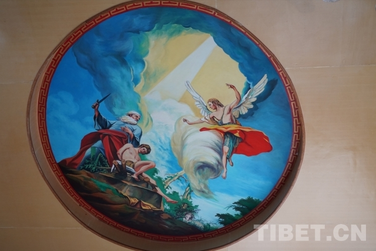 鹽井天主教堂由法國傳教士鄧得亮神父于1865年創(chuàng)建,此后又在2002年進行重修。該教堂成為今天以主教堂、鐘樓、生活區(qū)為主的建筑,主教堂內(nèi)部具有哥特式高大拱頂?shù)奶卣鳎唤ㄖ庑蛣t呈梯形,是藏族民居的常見式樣。天花板上繪滿《圣經(jīng)》題材、藏式風格的壁畫,四周則以圣經(jīng)故事畫面作飾品襯托。雖然內(nèi)部結(jié)構(gòu)為西方樣式,室內(nèi)裝飾卻不乏藏式風格,如唐卡畫形式的神像等。