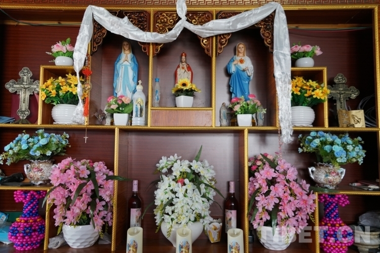 圖為阿多在耶穌、圣母瑪利亞像上懸掛哈達