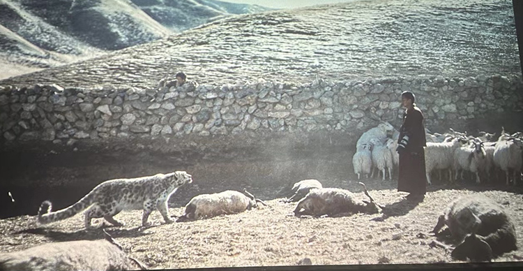影片的結(jié)尾似乎很突然,雪豹終究沒(méi)有死在受損牧人暴怒的情緒和揮舞的錘子下,在人類(lèi)文明的關(guān)照下,被主動(dòng)解圍,回歸雪山,與小雪豹相會(huì)相伴。只有萬(wàn)導(dǎo)這種深邃包容、沉著冷靜又充滿(mǎn)睿智的作家、藝術(shù)家才能挖掘和表現(xiàn),這里蘊(yùn)含著生命的慈悲和世人的智慧。對(duì)此,我們還有哪些拷問(wèn)呢?