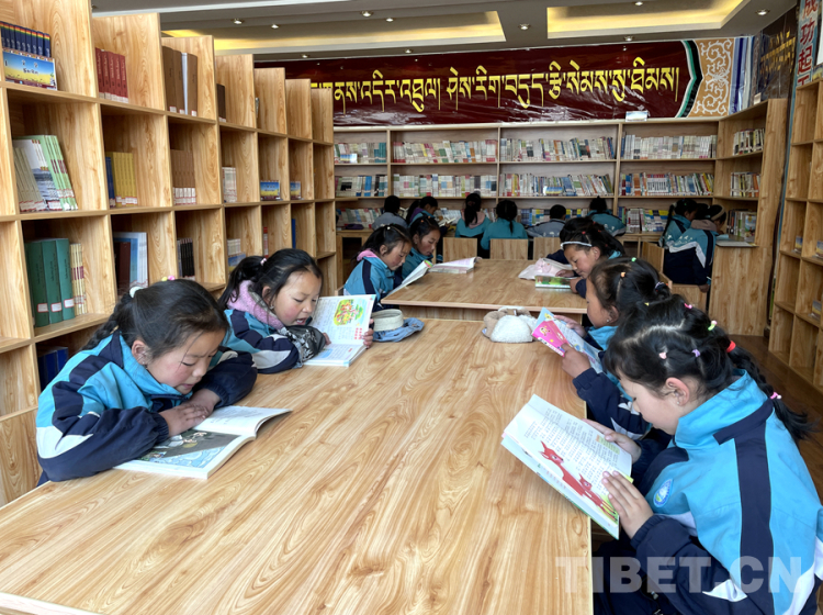 圖為4月23日,在西藏日喀則市薩迦縣雄麥鄉(xiāng)中心小學(xué)圖書館內(nèi),小學(xué)生們?cè)陂喿x書籍 攝影:頓珠次仁