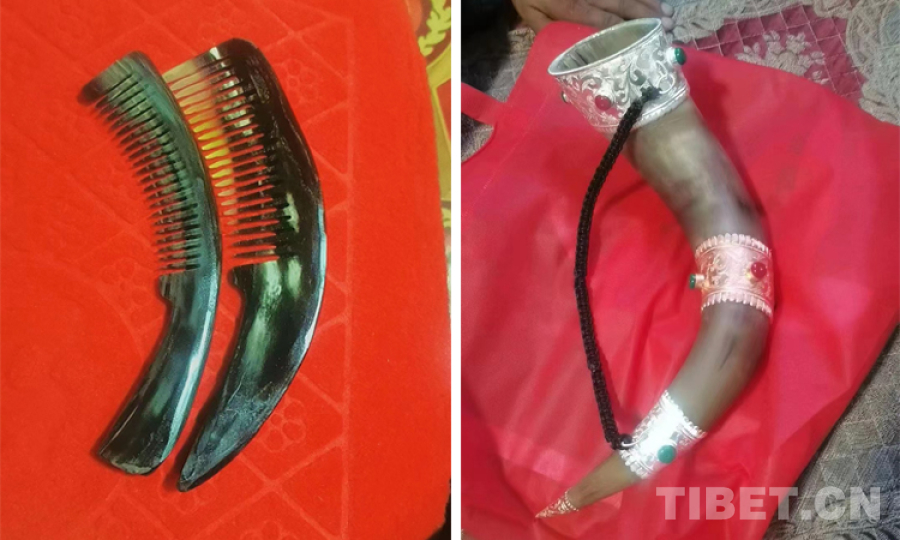 圖為麻木卓瑪管理站站長(zhǎng)洛達(dá)用牦牛角制作的梳子和酒器?。暹_(dá)供圖)