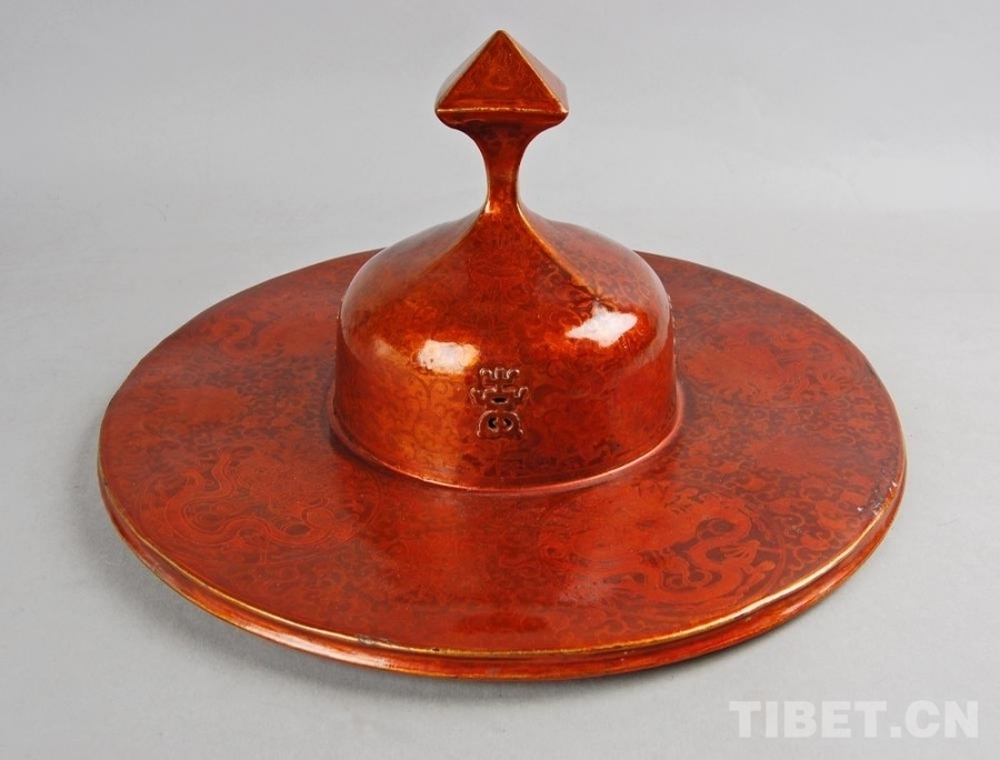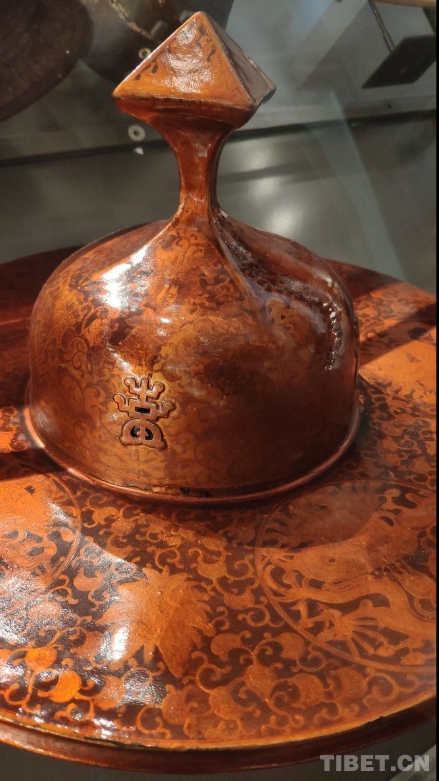 14號藏品為僧官帽,出自西藏,進入館藏時間為1905年。據(jù)博物館介紹,這頂漆帽原屬于寺院一位僧官所穿服飾的一部分。過去,西藏地方政府實行“政教合一制度”,寺院作為一個地方的宗教事務和寺院自身的管理者和統(tǒng)治者,同時又是這個地方社會的主要管理者和統(tǒng)治者。因此,遍布西藏各地的寺院往往都是當?shù)氐恼?、?jīng)濟、文化中心,具備政治、經(jīng)濟、教育、司法等職能。寺院內(nèi)部設立不同級別或不同分管領域的僧官來共同管理整個寺院的內(nèi)外政教事務。