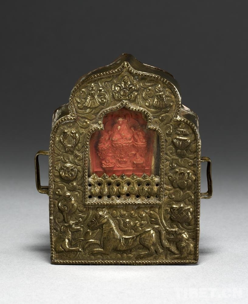 19號藏品為銅制“嘎烏”,內(nèi)裝有“擦擦”和香料包,出自西藏,進入館藏時間為1905年。“嘎烏”,是藏語的音譯,指護身佛的盒子,即小型佛龕。盒子里一般裝有“擦擦”佛像、印著經(jīng)文的綢片、舍利子或者甘露丸、由高僧念過經(jīng)的藥丸,以及活佛的頭發(fā)、衣服的碎片等。“嘎烏”還是精美的裝飾品。其形狀不一,一般為銀質(zhì)或銅質(zhì),盒面上鑲嵌有瑪瑙、綠松石,雕刻有多種花紋圖案。