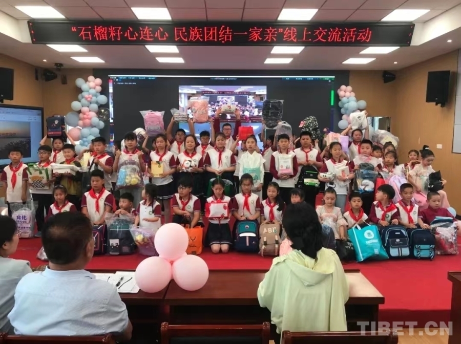 圖為安徽明光市明湖學(xué)校與西藏浪卡子縣打隆鎮(zhèn)小學(xué)開展“石榴籽心連心民族團(tuán)結(jié)一家親”線上交流活動