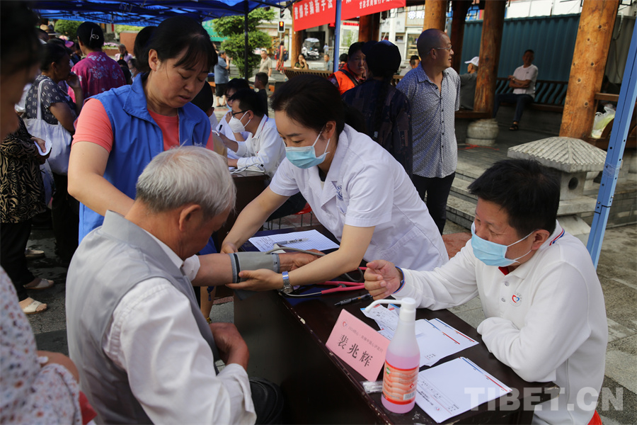 圖為瀘定橋廣場(chǎng)義診點(diǎn),專(zhuān)家正在為患者量血壓 攝影:登真巴珍