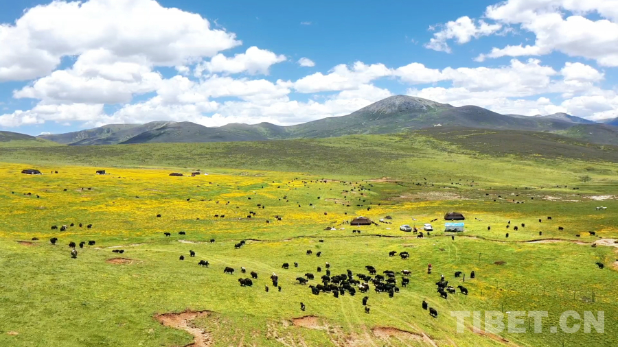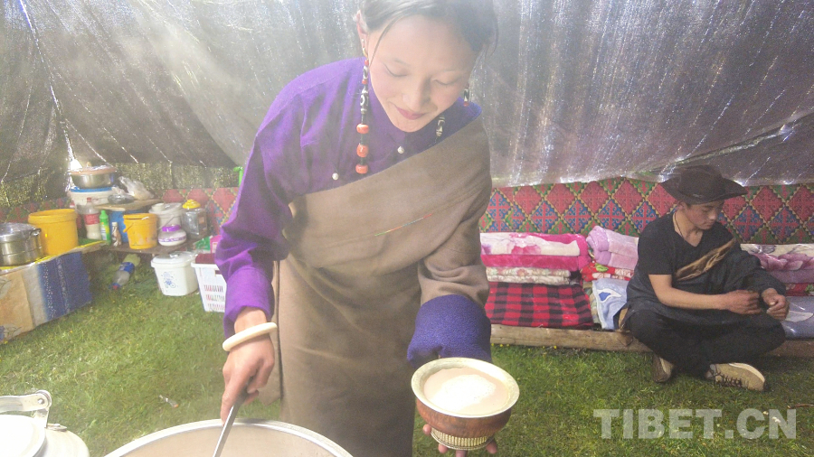 早晨天剛蒙蒙亮,他們就準(zhǔn)備出發(fā)了,一家人把生活必需品黑帳篷,火爐,鍋碗瓢盆,被褥及酥油糌粑等物資打包裝車,由家人先駕駛拖拉機(jī)把所有物資運(yùn)送到夏季遠(yuǎn)牧點(diǎn),四郎彭措則和他的侄兒騎馬趕牛出發(fā)。冬季牧場到夏季牧場距離60公里,他們經(jīng)過9個(gè)小時(shí)的遷徙,終于在下午3點(diǎn)到達(dá)夏季牧場。此時(shí)他的家人也在鄰居的幫助下搭好了帳篷,煮好了酥油茶等待著他們。到了夏季牧場,牦牛們也迫不及待奔向了肥美的水草,四郎彭措和他的侄兒也終于可以卸下滿身的疲憊,品嘗家人們準(zhǔn)備好的美食。夏季牧場正是一年當(dāng)中最美的季節(jié),草原上開滿了五顏六色的花朵,多日不見的好友也帶著自己的家人早一步駐扎在此地,四郎彭措說道:“夏季放牧,轉(zhuǎn)場雖然辛苦,但也是一年中難得的閑暇時(shí)光。夏季水草肥美,牦牛們有充足的食物,來到夏季牧場放牧的牧民也有更多的活動時(shí)間,賽馬、唱歌、跳鍋莊舞是我最喜歡的活動。”