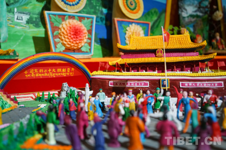 瓊科寺酥油花2018年被列入西藏自治區(qū)第五批自治區(qū)級非物質(zhì)文化遺產(chǎn)代表性項(xiàng)目?!斑@個展廳里最大的一幅作品,是我們寺院內(nèi)20多名僧人花10天時間制作完成的。我們寺院每年都會有符合時代旋律的新時代題材作品創(chuàng)作產(chǎn)生,我希望通過我們一年一年、一點(diǎn)一滴的努力,能夠終有一日將酥油花申報為國家級非物質(zhì)文化遺產(chǎn)代表性項(xiàng)目?!杯偪扑滤钟突ǚ沁z傳承人阿旺西尼說。