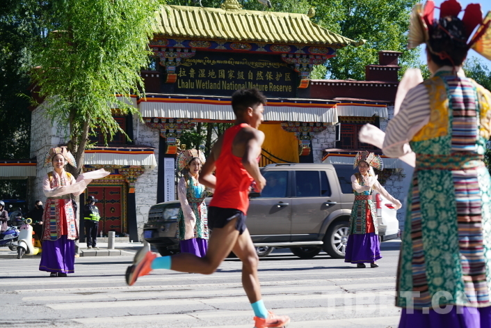 圖為 2024拉薩半程馬拉松18公里處參賽選手途經拉魯濕地國家級自然保護區(qū),拉薩市城關區(qū)藏戲藝術團以藏戲的形式為選手加油助威 攝影:趙振宇