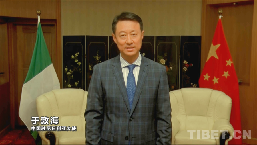 圖為中國駐尼日利亞大使于敦海通過VCR致辭