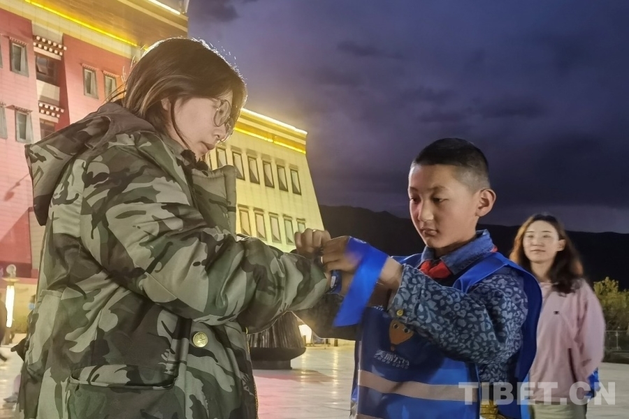 夜幕降臨,研學(xué)游團(tuán)隊(duì)來(lái)到文成公主劇場(chǎng)。穿上藍(lán)馬甲,孩子們搖身一變成了文明旅游的小小宣傳員。帕里鎮(zhèn)小學(xué)注重培養(yǎng)學(xué)生的生態(tài)文明意識(shí),自2023年7月起,主動(dòng)加入“美麗公約”志愿組織的“擦亮天路行動(dòng)”。學(xué)生定期在帕里鎮(zhèn)清理垃圾,也會(huì)為沿國(guó)道562來(lái)到帕里的游客宣傳垃圾隨身走的文明旅游理念。今天,來(lái)到拉薩,孩子們?cè)俅问炀毜叵騽?chǎng)周圍的觀眾宣傳起來(lái),一邊為大家在右臂系上代表文明旅游承諾的藍(lán)絲帶,一邊鼓勵(lì)“一起守護(hù)第三極,因?yàn)橛心?,中?guó)更美”。一時(shí)間,文成公主劇場(chǎng)周圍成為了藍(lán)絲帶的海洋。