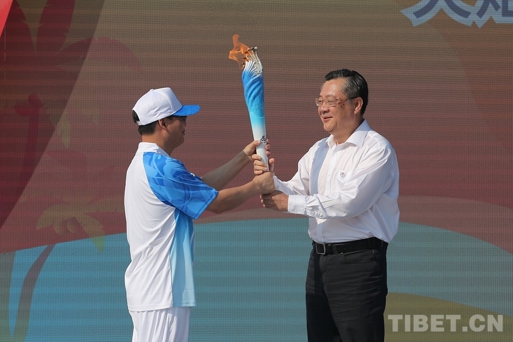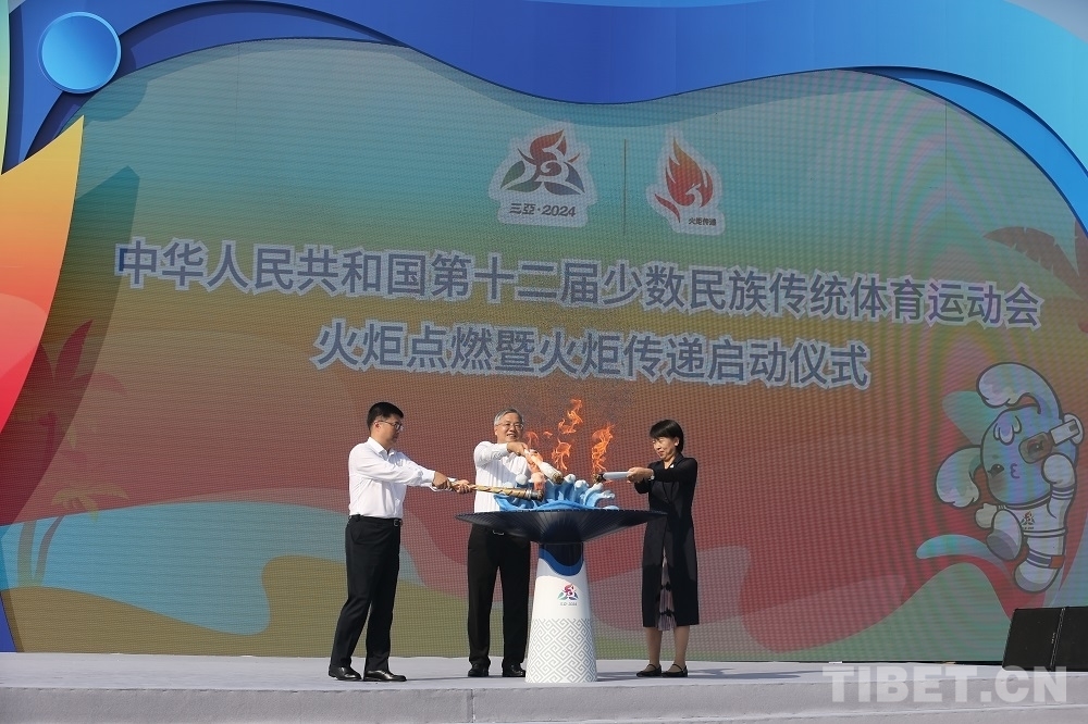 中國西藏網(wǎng)訊 10月9日,中華人民共和國第十二屆少數(shù)民族傳統(tǒng)體育運動會(以下簡稱運動會)火炬點燃暨火炬?zhèn)鬟f啟動儀式在海南省三亞市天涯海角舉行。采集自海南熱帶雨林國家公園的“生態(tài)之火”、航行海洋之中“探索二號”科考船的“科技之火”、崖州灣國家南繁科研育種基地的“希望之火”同頻共燃,匯聚成象征中華民族一家親、同心共圓中國夢的“同心之火”,表達著全國各族人民攜手并肩、共同邁向美好未來的堅定決心。