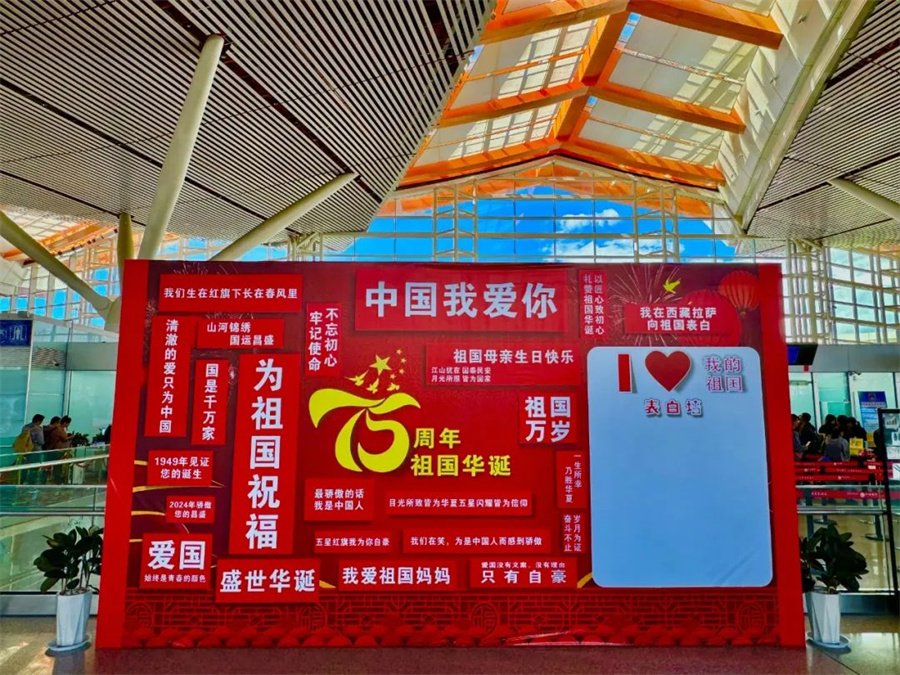 圖為拉薩貢嘎國(guó)際機(jī)場(chǎng)T3航站樓內(nèi)設(shè)置的愛國(guó)表白墻