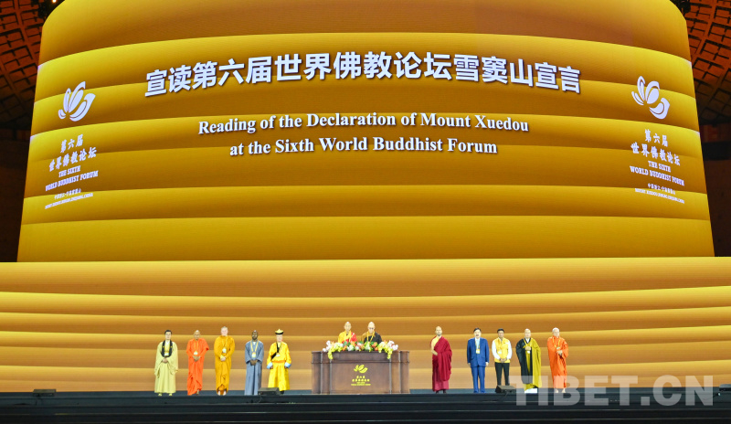 圖為閉幕式現(xiàn)場(chǎng)宣讀第六屆世界佛教論壇雪竇山宣言