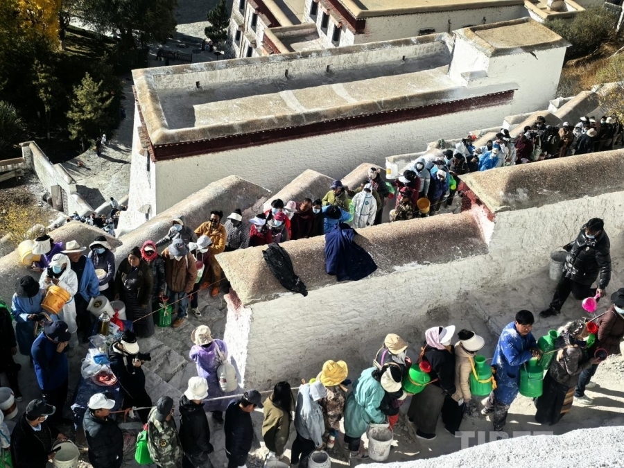 圖為群眾在布達(dá)拉宮刷墻現(xiàn)場排起長隊(duì) 攝影:王淑