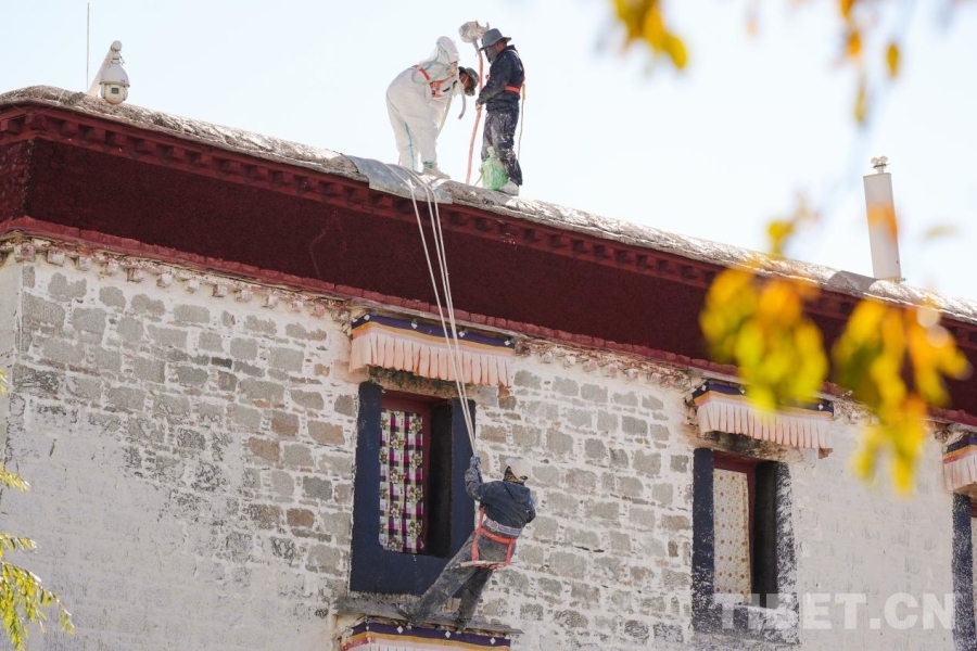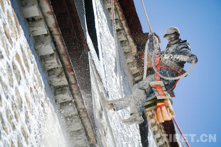 圖為專業(yè)工人正在為布達(dá)拉宮外墻噴涂涂料 攝影:趙振宇