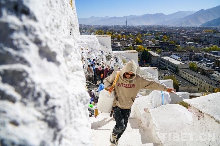 中國西藏網(wǎng)訊 巍峨的布達(dá)拉宮,是日光之城拉薩的象征,悠久的歷史,古老的文化,博得世人的矚目和贊賞。每到金秋時(shí)分,布達(dá)拉宮也即將進(jìn)入一年中最“絢彩”的時(shí)刻,大量當(dāng)?shù)厝罕姾陀慰突碇驹刚?,共同為粉刷布達(dá)拉宮的外墻而做準(zhǔn)備,以便更好地保護(hù)這一古老的世界文化遺產(chǎn)建筑。