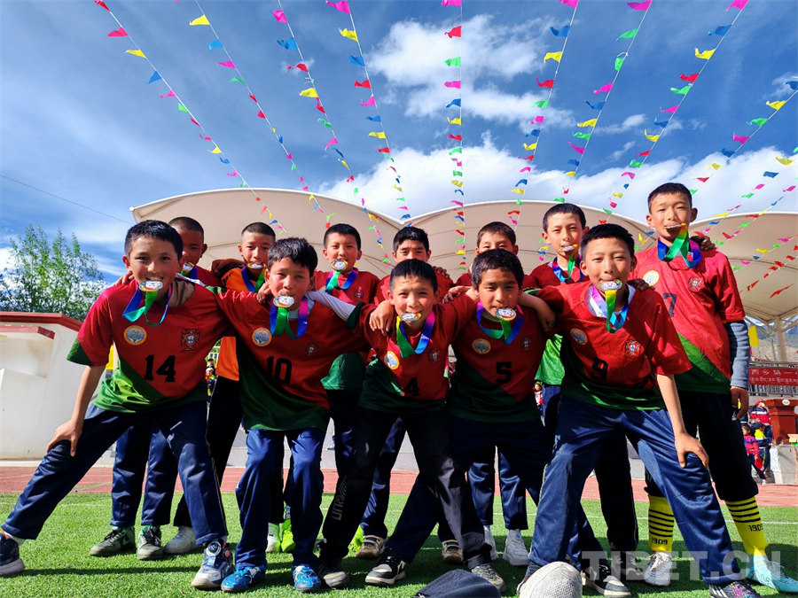 圖為洛隆縣俄西鄉(xiāng)第一小學的學生們在足球場上開心合影