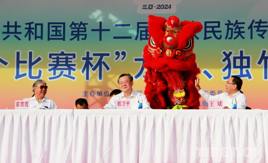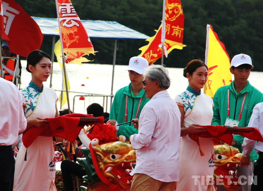 賽前,在龍舟巡游活動(dòng)后,國(guó)家民委副主任郭衛(wèi)平,海南省委常委、宣傳部部長(zhǎng)王斌,香港代表團(tuán)顧問(wèn)、中國(guó)香港體育協(xié)會(huì)暨奧林匹克委員會(huì)會(huì)長(zhǎng)霍震霆,香港代表團(tuán)團(tuán)長(zhǎng),香港文化體育及旅游局體育專員蔡健斌,國(guó)家民委文化宣傳司司長(zhǎng)張謀,國(guó)家民委港澳臺(tái)辦公室主任魏國(guó)雄,海南省政府副秘書(shū)長(zhǎng)國(guó)章成,國(guó)家民委文化宣傳司副司長(zhǎng)張劍輝,國(guó)家民委港澳臺(tái)辦公室副主任趙靜,海南省民委副主任黎梁東,海南省旅文廳副廳長(zhǎng)王忠云,海南省三亞市政府副市長(zhǎng)張長(zhǎng)豐為龍舟點(diǎn)睛、披紅,將比賽氛圍烘托得格外喜慶熱烈。