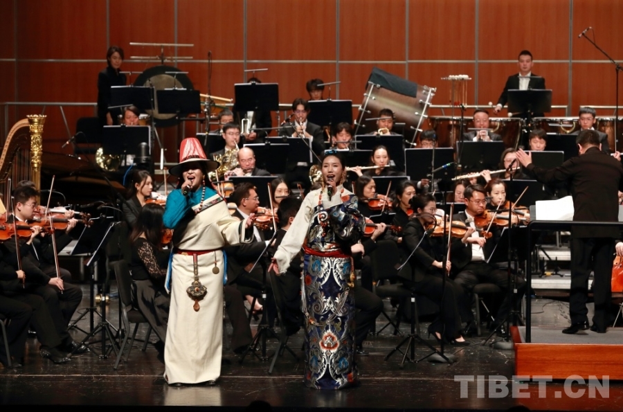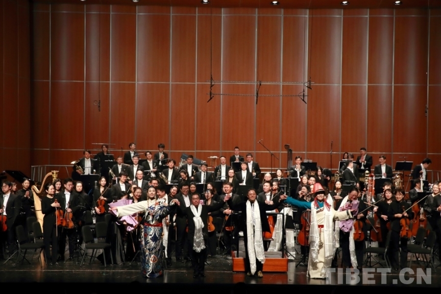 音樂會(huì)上,兩位藏族歌手演唱了交響樂主題曲《金橋》,歌曲高亢嘹亮、曲調(diào)悠揚(yáng)。藏戲、山歌等元素的加入,讓交響樂更加豐富,充滿了濃郁的民族風(fēng)情。