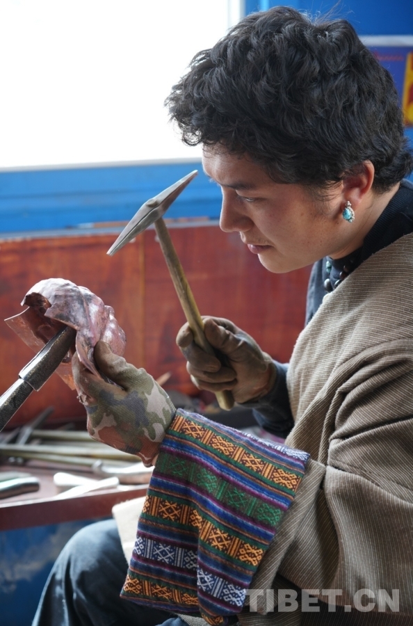 叮叮叮,叮叮?!し欢?,傳來一陣陣金屬敲擊的聲響。掀開門簾,一個小伙子坐在窗邊,右手拿錘,左手握著佛像架在細長的鐵器上,右手的錘子不停地敲擊著,左手也在一邊輕微轉(zhuǎn)動,目光緊緊鎖在眼前的佛像上柔和而堅定,古銅色的面龐與紅銅佛像仿佛在進行無聲的“對話”。