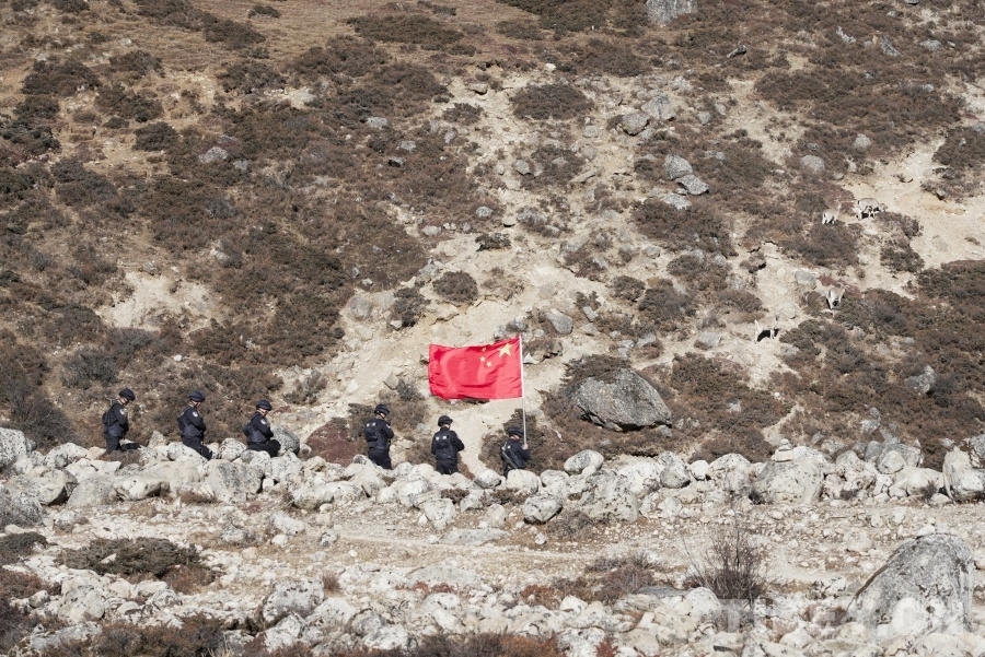 圖為色邊境派出所移民管理警察在巡邏途中與國家二級保護動物巖羊“同框” 攝影:郭遠(yuǎn)敬