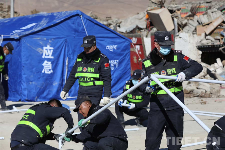 圖為西藏移民管理警察在定日縣長所鄉(xiāng)雜村為受災(zāi)群眾安裝帳篷 攝影:郭遠敬